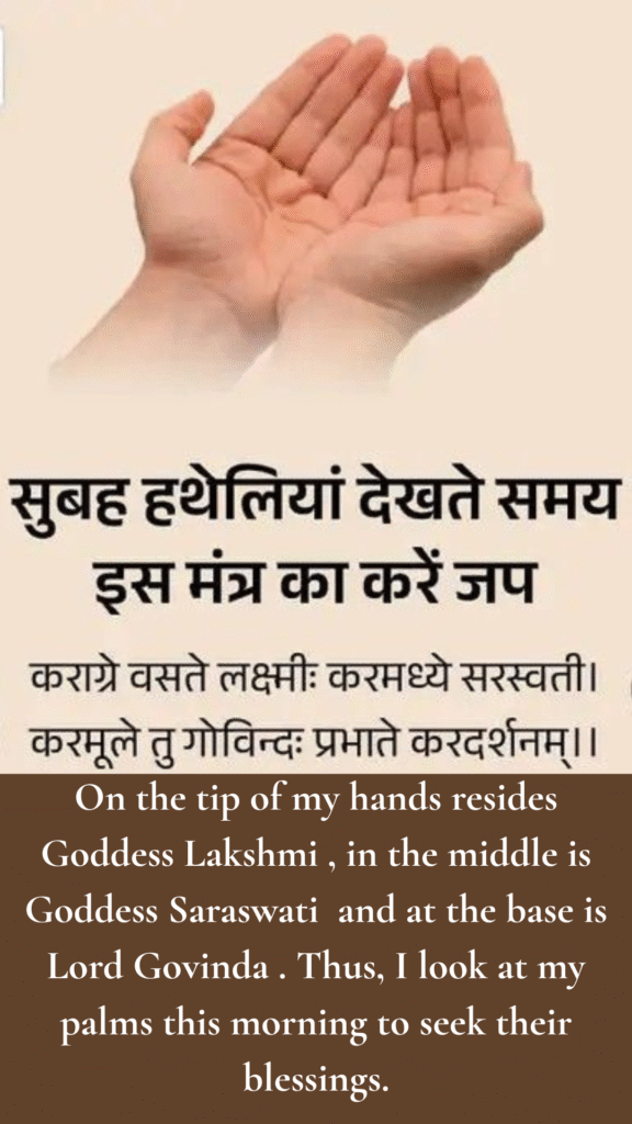 “On the tip of my hands resides Goddess Lakshmi (goddess of wealth and prosperity), in the middle is Goddess Saraswati (goddess of knowledge), and at the base is Lord Govinda (Lord Vishnu, the sustainer). Thus, I look at my palms this morning to seek their blessings.”
