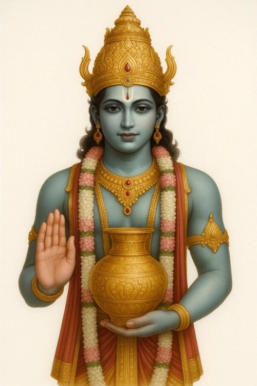 “I bow down to Lord Dhanvantari, an incarnation of Lord Vasudeva. He holds a pot of nectar in his hand, and he is the remover of all diseases. He is the lord of the three worlds, and I bow to that great Lord Vishnu.”