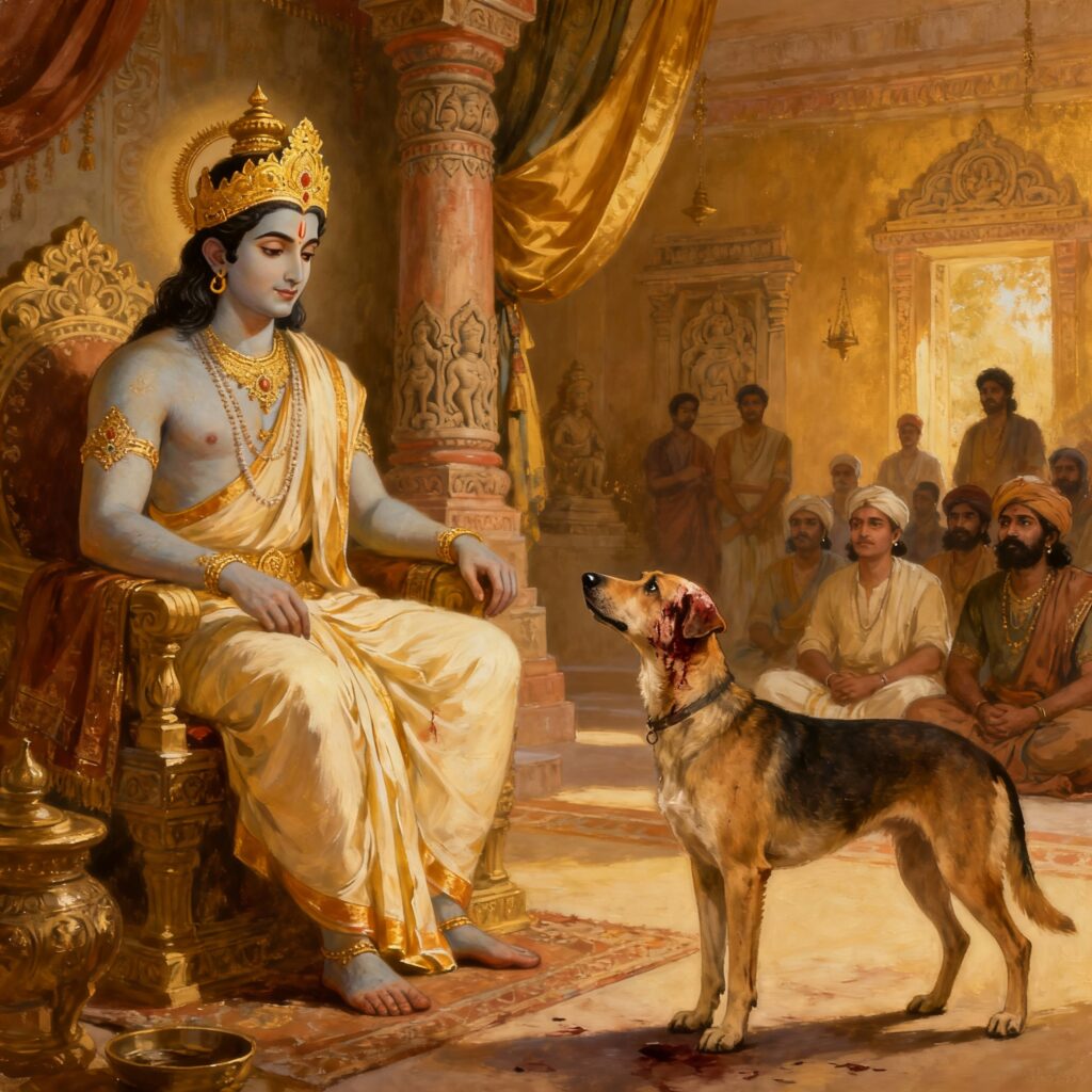 The dog approached Rama’s court and said, “O Rama, I seek justice. A man named Sarvarthasiddha struck me on the head cruelly without any reason. I want justice.”