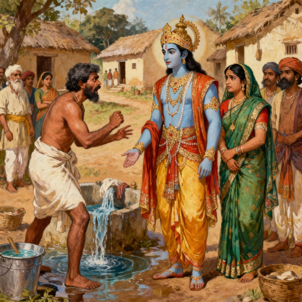 Here is the complete story of the Washerman from sacred texts that illustrates a key episode after Rama’s return, highlighting themes of justice, societal perception, and dharma: